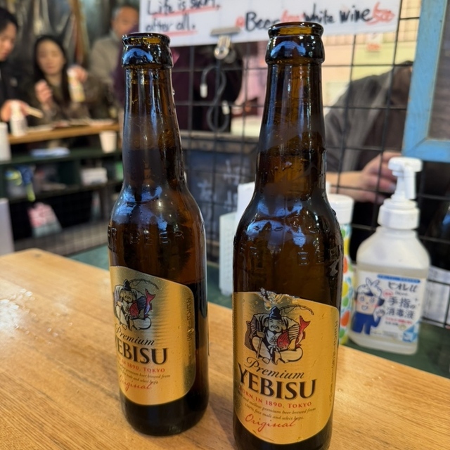 本店は朝7時から。瓶ビール大瓶が390円。